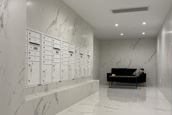 Supplied all large format porcelain tile throughout Lobby, Elevator Cabs, Elevator Bank Walls, Bike Room, Mail Room, Building Corridors, Trash Rooms, Unit Bathrooms. Supplied all installation and surface preparation materials such as adhesives, waterproofing and crack isolation materials, self-leveling underpayments, mortars. Supplied engineered wood flooring in unit apartments.